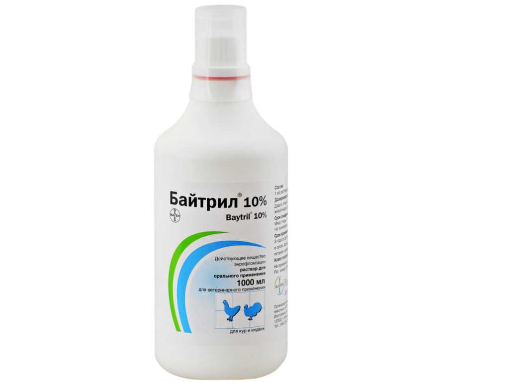 Рекомендуемая дозировка – 10 мг энрофлоксацина на 1 кг массы (с питьевой водой за сутки), или 5 мл препарата, разведенные в 10 л воды. Лечение, при котором птица пьёт воду с байтрилом, занимает, как правило, трое суток, но не менее 5 суток – при сальмонеллёзе.