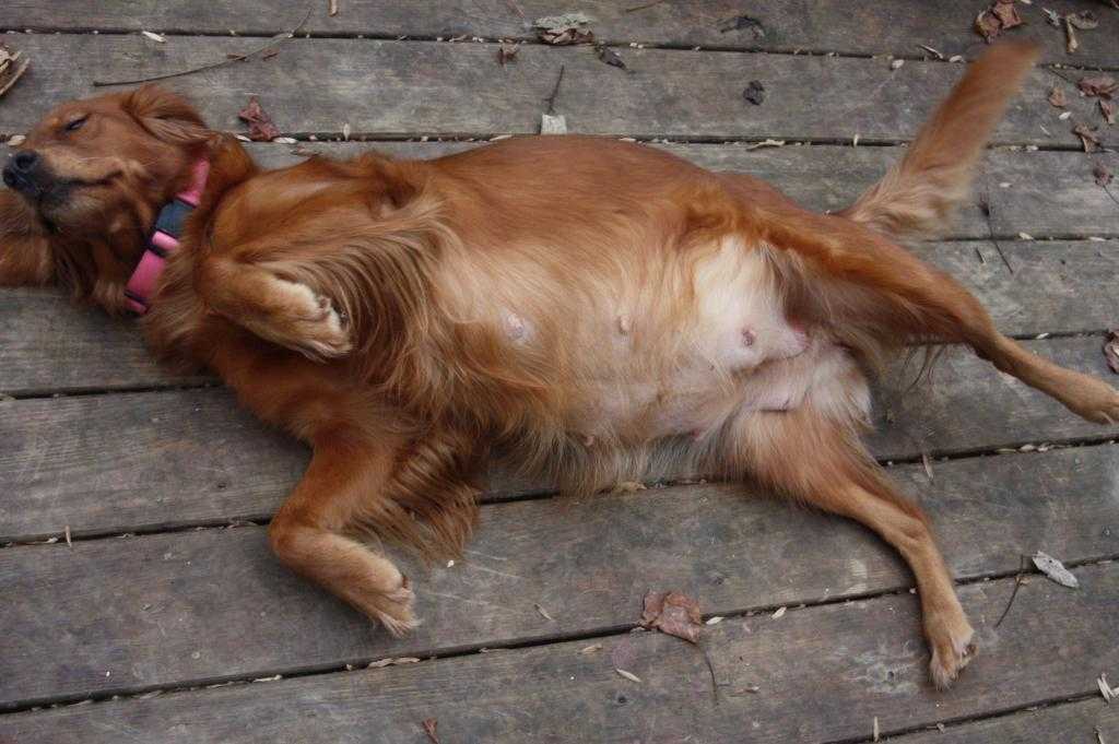 У собаки пропадает интерес к противоположному полу, она много спит. Портится аппетит. К концу второй недели возможно видоизменение сосков – они становятся темнее и увеличиваются в размерах, кожа вокруг сосков грубеет.