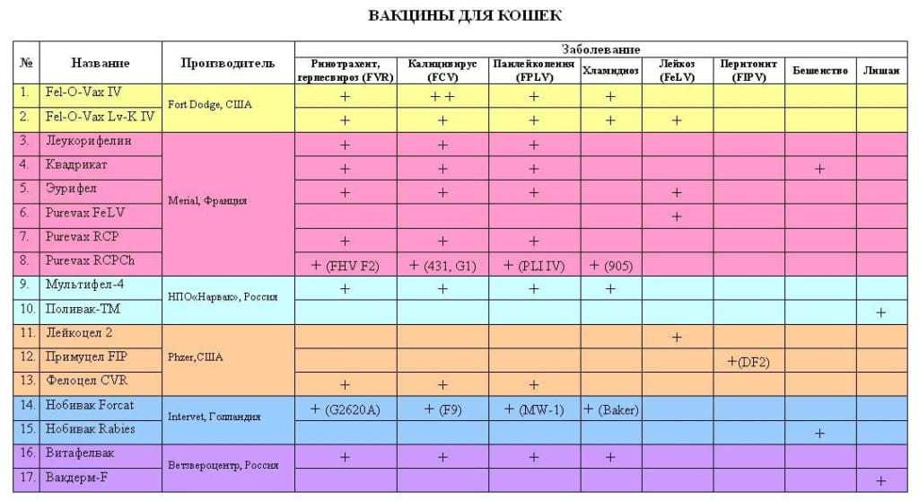 - в обязательный список входят вакцины от панлейкопении, калицивироза, ринотрахеита и бешенства. Прививка от бешенства всегда ставится отдельно, остальные инфекции прививаются поливакциной;