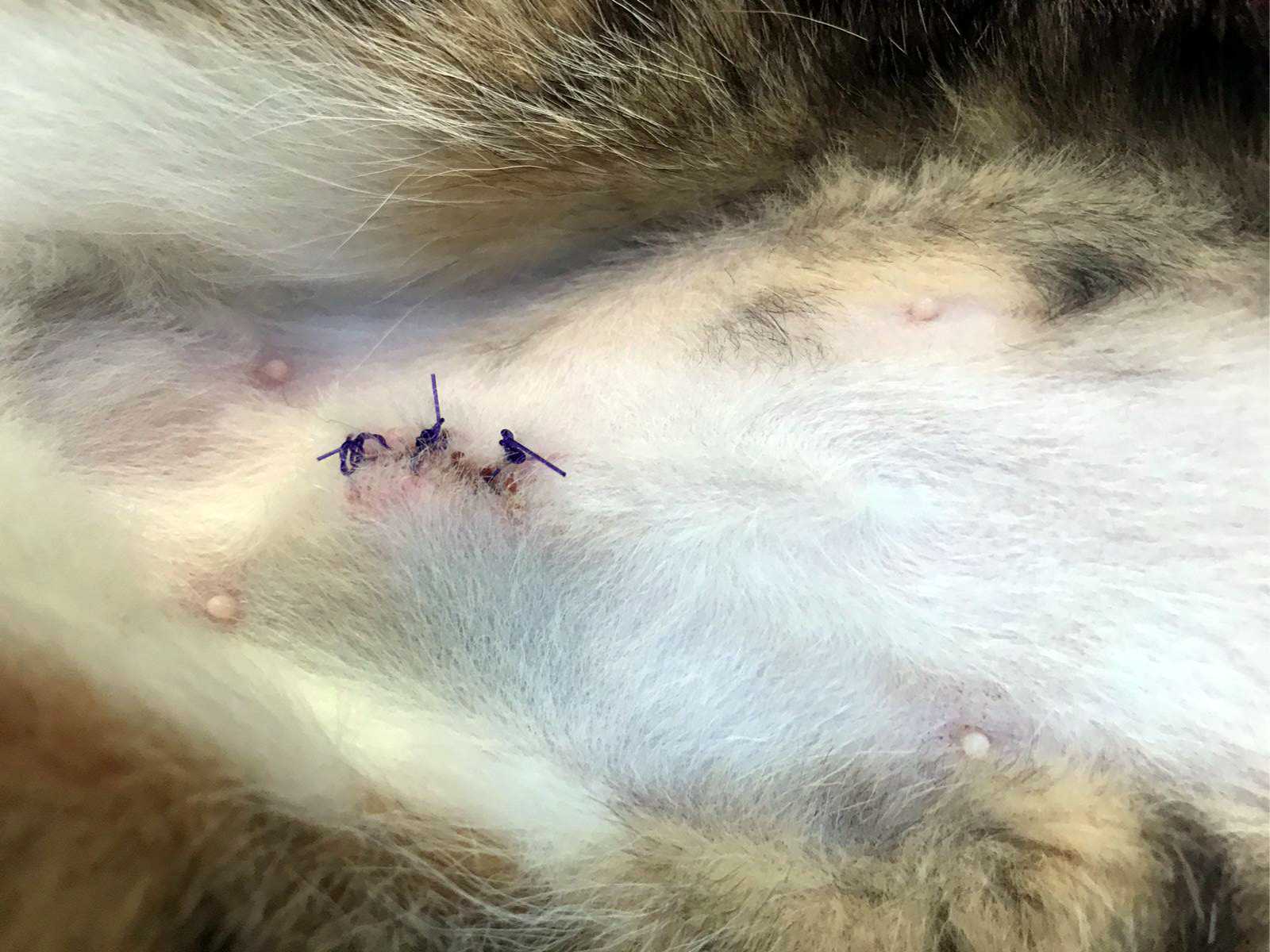 4. Из свежей раны после операции несколько дней выделяются кровянистые выделения (сукровица), подсыхающие на шерсти. В летний жаркий период это может привлечь к животному кровососущих паразитов, являющихся источниками опасных инфекционных заболеваний.