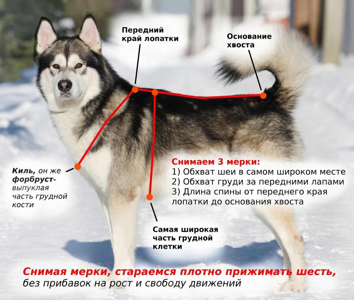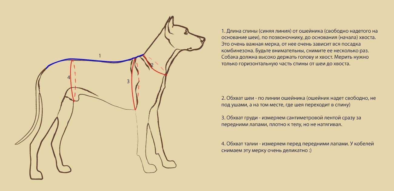 При выборе одежды, кроме обхвата холки и грудной клетки вам понадобится замер от холки до хвоста. Этот замер снимается путем откладывания сантиметровой ленты от точки в которой сходятся шея и лопатки до точки, в которой хвост становятся подвижен. Опять же, если вы сомневаетесь в том, что пропорция вашего питомца совпадают со стандартами, вы можете примерить понравившуюся вам аксессуары в зоомагазине и снять замеры с готового изделия.