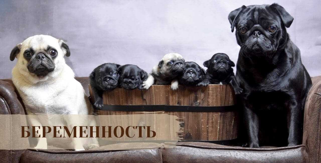 Длительность беременности у мопсов составляет 60-62 дня, обычно она многоплодная (4-6 щенков). Понять, беременна ли самка, делается возможным только на втором месяце, когда проявляются первые признаки «интересного положения» собаки: