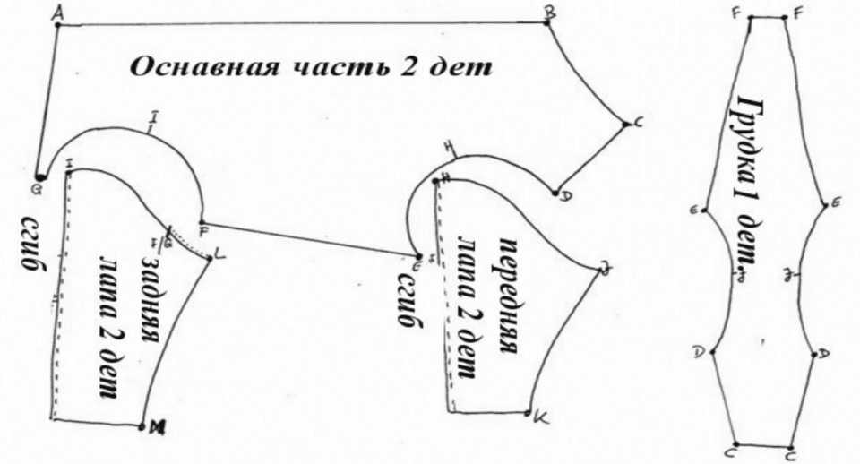 Выкройка комбинезона состоит из 4 частей. Основная часть из двух деталей, по две детали передних и задних лап и грудка. Для девочки эта часть длинная, закрывающая весь живот. Застежка вшивается в верхний шов. Для мальчика можно сделать комбинезон по этой же выкройке, уменьшив деталь грудки. Или найти другую выкройку с вырезом на животе. Если комбинезон делается на подкладке, рекомендуется прошить оба слоя в нескольких местах, чтобы она не сбивалась.