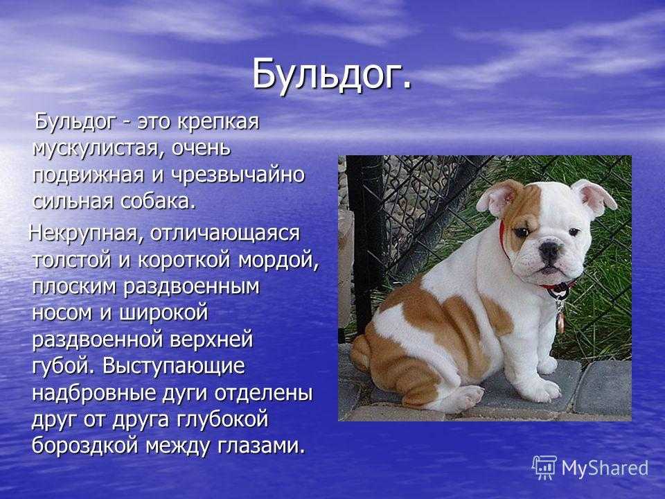 Название породы родилось из двух слов “bull” – бык, “dog”- собака. Изначально бульдогов использовали только как бойцовую собаку и для травли крупного зверя.
