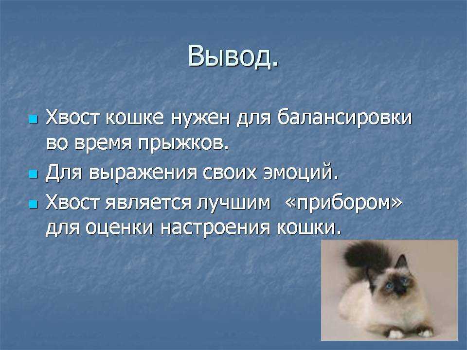 Перед тем, как спросить, зачем кошке нужен хвост, следует более детально понаблюдать за поведением своего питомца и установить, как часто она его использует. Можно заметить, что он находится в движении практически всегда. Это не только точное средство общения, но и приспособление для поддержания баланса, позволяющее выживать в самых негативных условиях окружающей среды, взбираться на высокие предметы, ловко передвигаться и т. д. В различную погоду с помощью хвоста пушистики регулируют температуру собственного тела. Владельцы кошек должны помнить, что хвост является индикатором здоровья питомца.