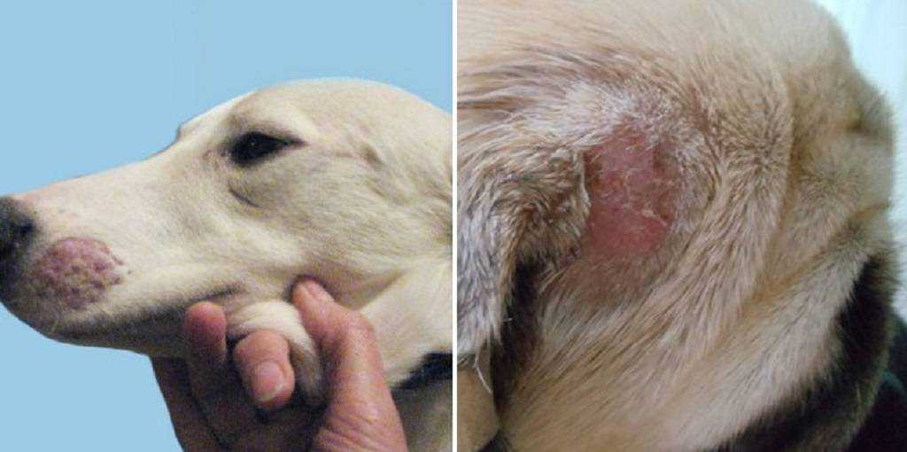 Важно: стригущий лишай у собаки необходимо лечить сразу же после обнаружения, иначе будет хуже чем на правом фото вверху