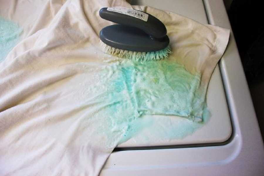 Небольшой объем пятновыводителя нужно нанести на материю, либо развести концентрированный препарат в соответствии с инструкцией. Далее готовят мыльный раствор и оттирают оставшуюся часть пятна. Если вы решили вывести зеленку из поверхности дивана стиральным порошком, основательно разведите его в воде. Лишняя минута не страшна, зато появится пена, которую удобнее и практичнее втирать щеткой, нежели простой раствор.