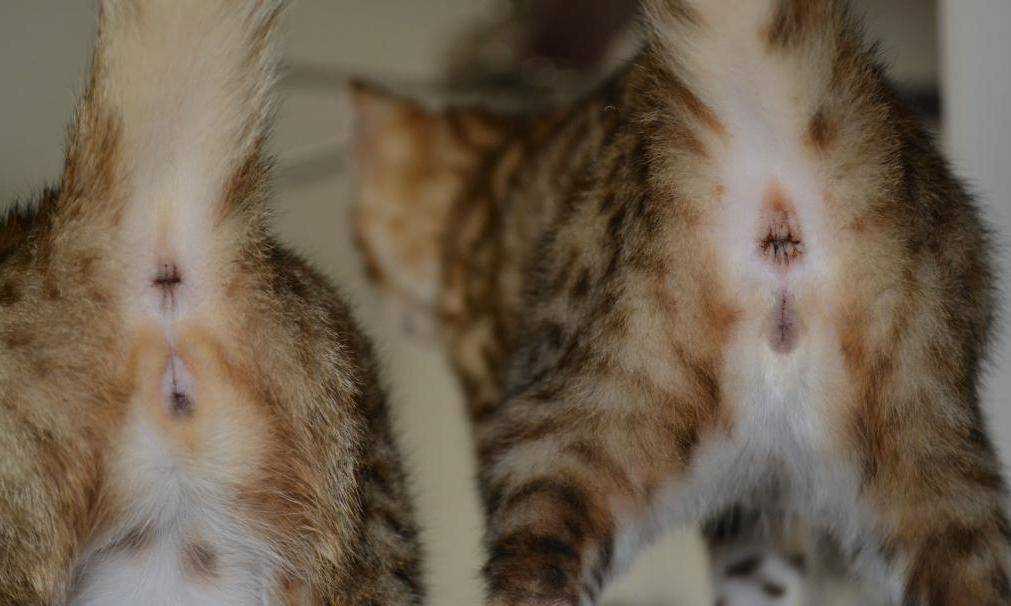 - У недавно рожденных мальчиков половые органы похожи на двоеточие. В 1 – 1,5 см от заднего прохода находится мошонка с яичками, под ней – отверстие крайней плоти. Также у самцов между анусом и пенисом больше шерсти, чем у кошек.