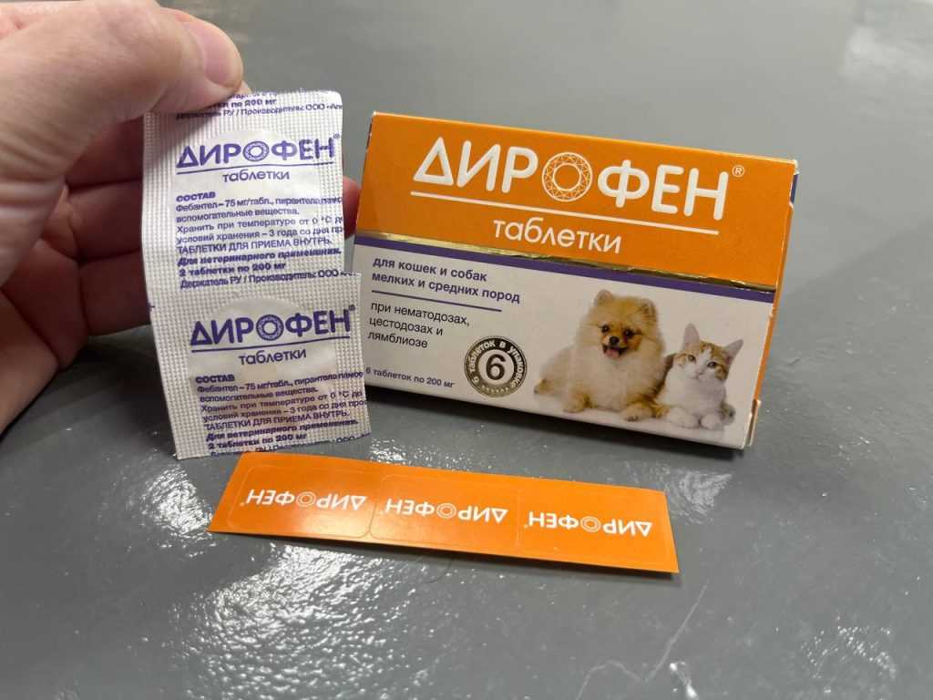 Таблетки Дирофен отличаются от предыдущей группы препаратов только наличием третьего действующего вещества. Кроме пирантела и празиквантела они содержат фебантел. Дирофен (Апиценна, Россия) также разрешён котятам начиная с возраста 3 недель, беременным кошкам за 3 недели до родов и лактирующим через 2-3 недели после родов.