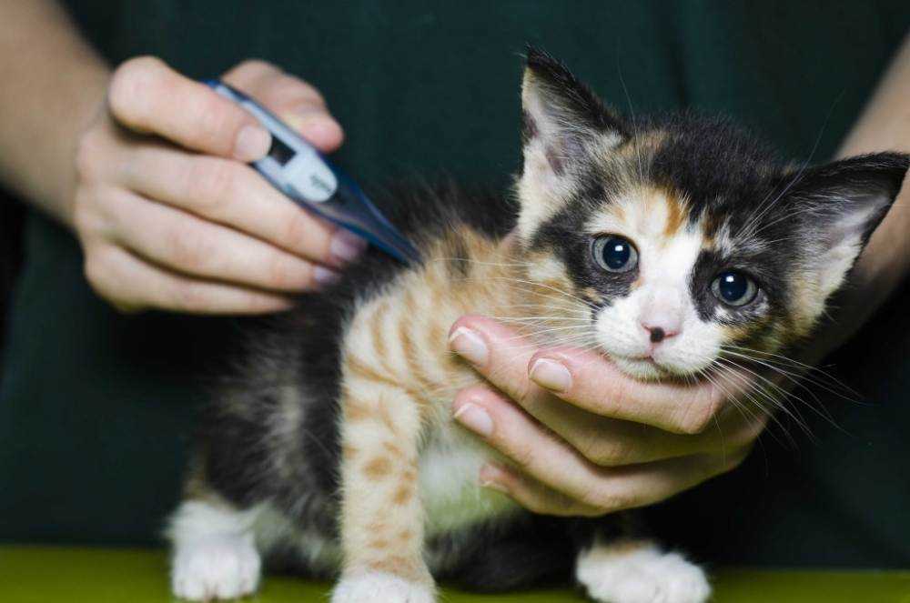 Перед вводом ректального термометра его кончик обрабатывается антисептическим средством, смазывается вазелином и осторожно вкручивающимися движениями вводится в проход на глубину 1 см для взрослой особи и 0,5 см для котенка