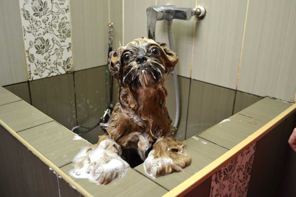 - Водные процедуры. Собаку необходимо регулярно мыть, периодичность купания для домашней собаки достаточно установить от одного до трёх раз в месяц в зависимости от загрязнённости. Помимо этого, соблюдать гигиену и мыть питомца хотя бы частично (лапы, живот, морда и под хвостом) стоит после каждой прогулки.