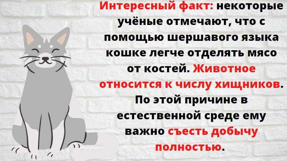Ускорение процесса пережевывания пищи. Кошки являются облигатными хищниками и основу их рациона составляет мясо. Шершавый язык у кошек необходим для лучшего разделения мясных волокон.