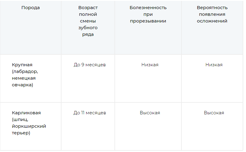 Существуют породные особенности смены зубов. Если ваш питомец претендует на выставочную карьеру, лучше, чтобы за процессом смены зубов и формированием прикуса, следил ветеринарный врач.