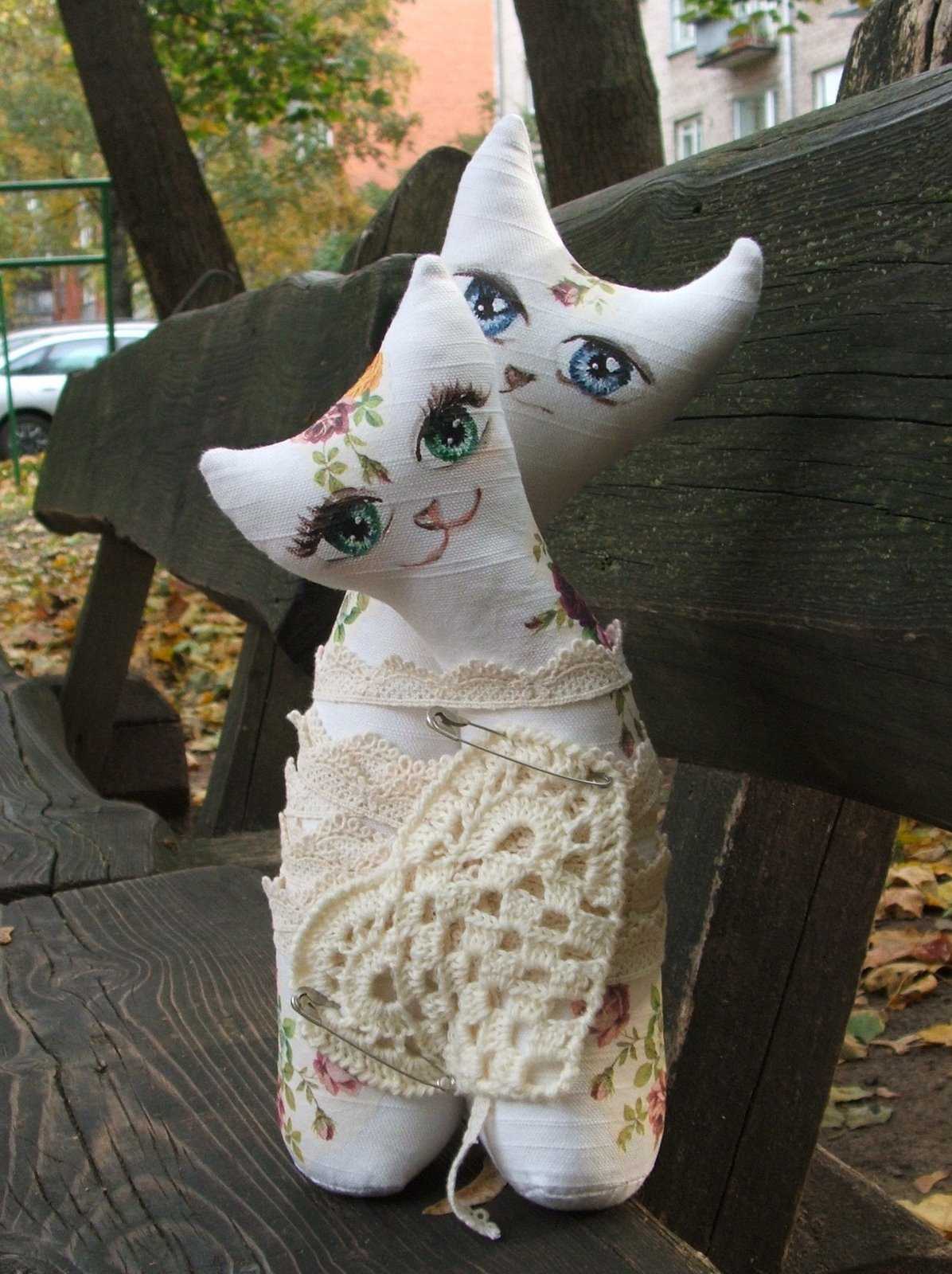 Выкройку платья для кота делают так — измеряют по кукле необходимую длину и ширину платья. На бумаге по полученным данным рисуют прямоугольник. На этом этапе следует убавить верхнюю часть платья — получается трапеция. Переводят выкройку на цветную ткань, вырезают две детали и складывают лицом к лицу, сшивают своими руками или на машинке, оставляя отверстия под руки и голову. Для хвоста делают отверстие с помощью ножниц. Украшают платье кружевом, лентами, бантами. Тильда готова.