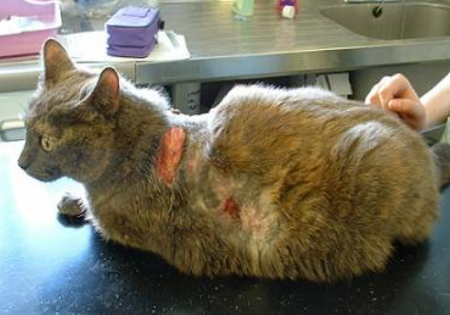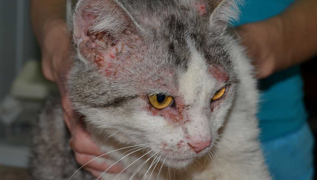 В легкой форме по коже заметны белые прыщики с гноем, частичное облысение, красные корочки, расчесы и мелкая сыпь. При длительном течении кошка легко расчесывает пустулы до язв, заносит инфекции, бактерии, сильно слабеет, теряет аппетит.