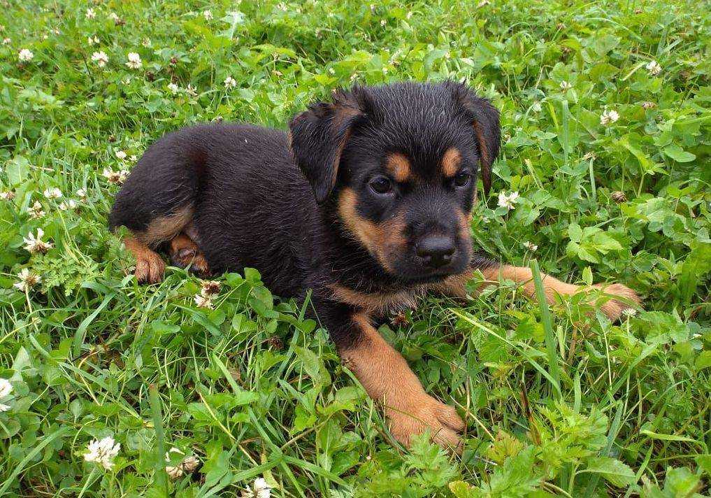 - Хаски и ротвейлер. Пес обладает дружелюбным характером и приветливостью. Он выбирает из всей семьи одного хозяина, и слушается только его. Крупная собака достигает в росте 60 см. Окрас может быть чисто черным, или смешанным с цветами родителя хаски.