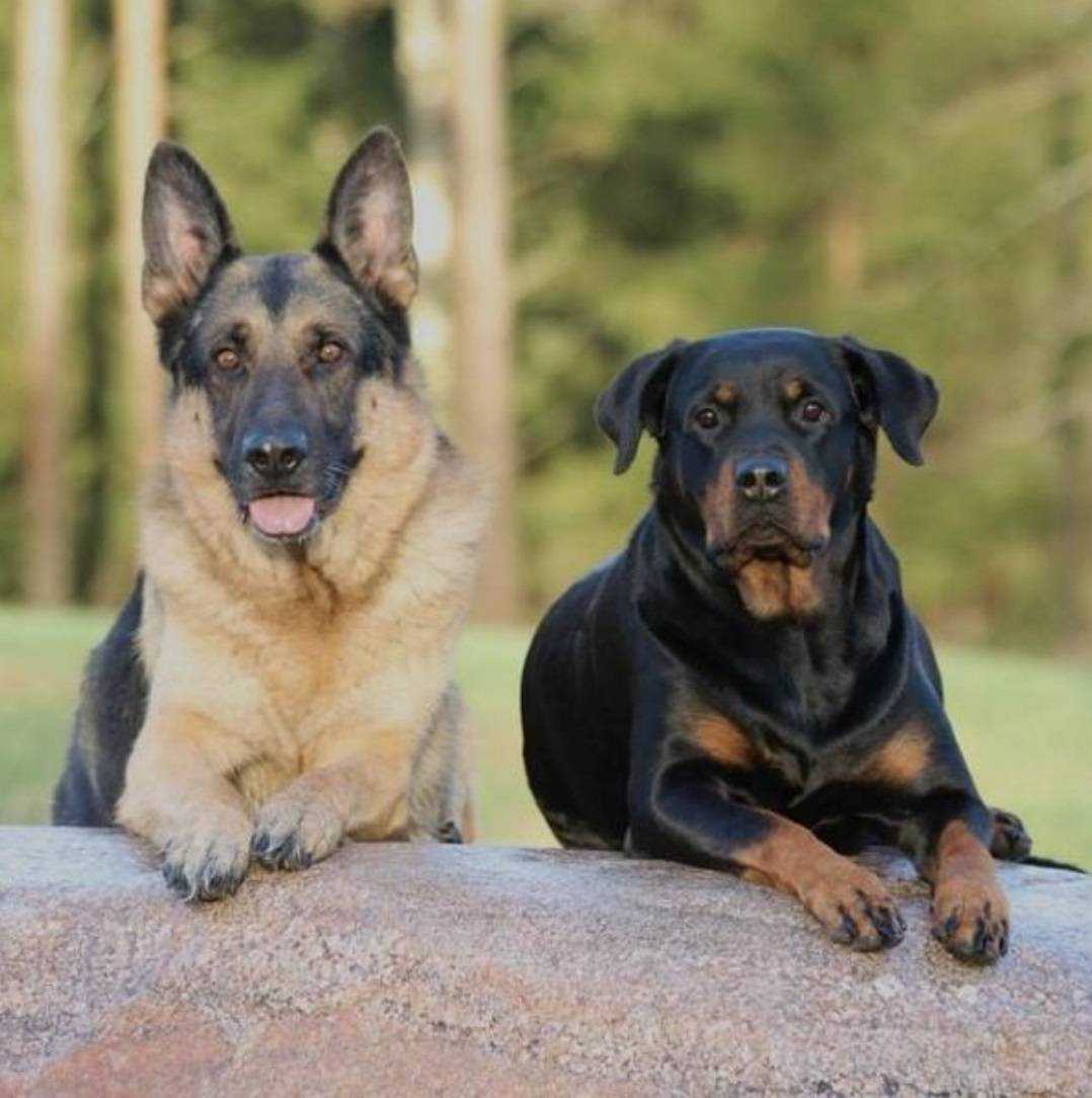 Овчарки и ротвейлеры – преданные, сильные, выносливые существа. Они отлично справляются с поставленными задачами, защищают и охраняют свою территорию. Но немец более спокойный, дружелюбный, что нельзя сказать о ротвейлере.