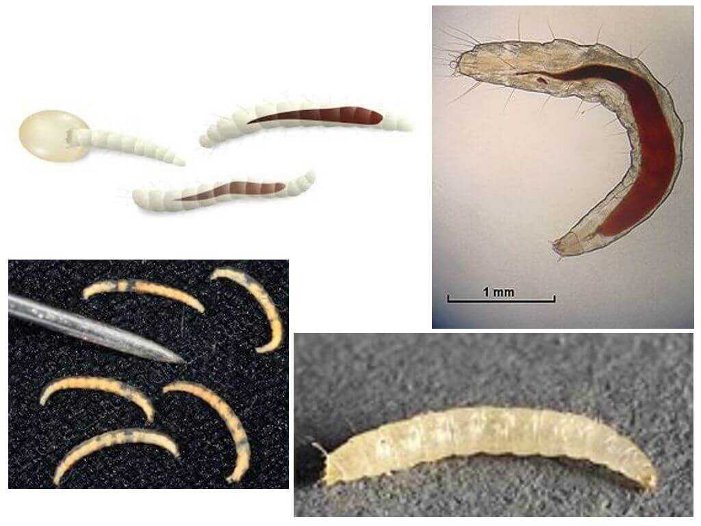 По внешнему виду личинки блох напоминает белых червей, длиной около 1 мм. На их теле есть тоненькие волоски. Личинки в состоянии быстро передвигаться. Они растут, и за всю стадию своего развития 3 раза линяют и достигают размера до 6 мм. Питаться они могут органическими материалами, находящимися рядом с ними или на их теле. Личинки блох у кошек, собак, других животных, независимо от того, на ком они паразитируют, выглядят одинаково. Поэтому если человек их заметит, он не сможет понять, какому насекомому они принадлежат. Если интересно узнать, как выглядят личинки блох, можно посмотреть фото, имеющиеся на сайте. Следует знать о том, что на шерсти кошек и собак личинки не живут. Поэтому если их хозяева обнаружили вредителей в виде червяков – это не личинки.