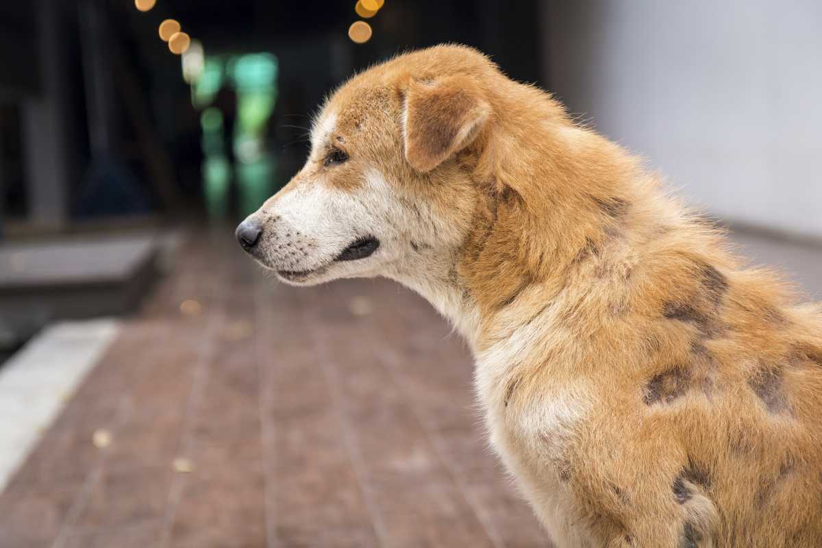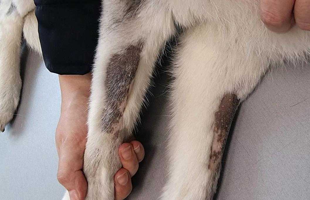 Еще одна причина облысения пса — трихофития (стригущий лишай). Сопровождается появлением красноватых пятен, наростов и сильным шелушением кожи. Шерсть выпадает очень быстро, собака постоянно хочет чесаться.