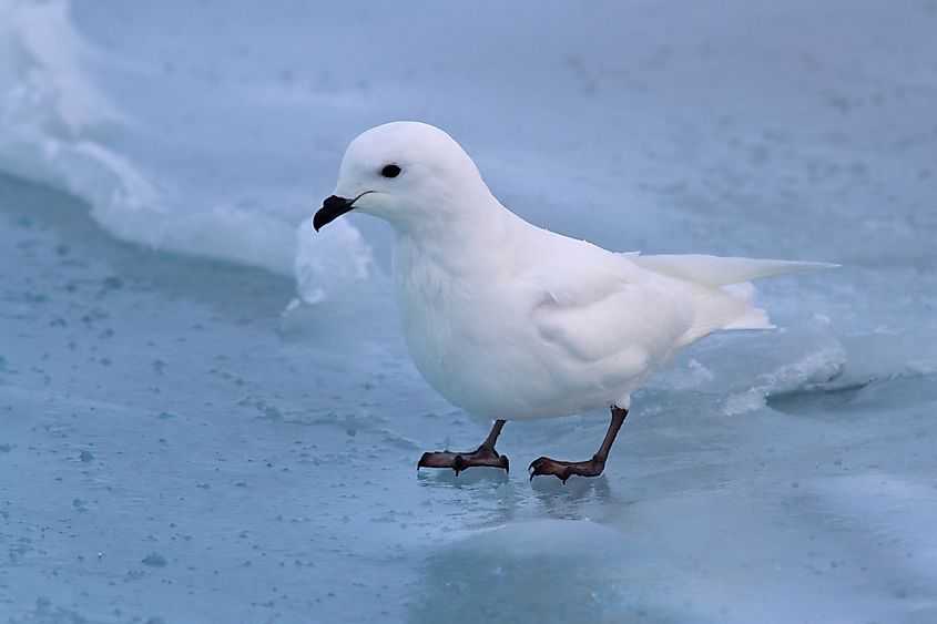 Snow Petrels are tiny, 11 to 16 inches-tall dwellers in Antarctica and one of the most beautiful ones. The aptly-named birds boast snow-white feathering that makes one think of «purity.» Their elongated bodies aid in sheltering them from predators and cold by nesting in crevices. The black eyes and beaks stand out in the barren Antarctica snowy ground. One can see the bird near open water, packing ice, or continuous ice along the coast.