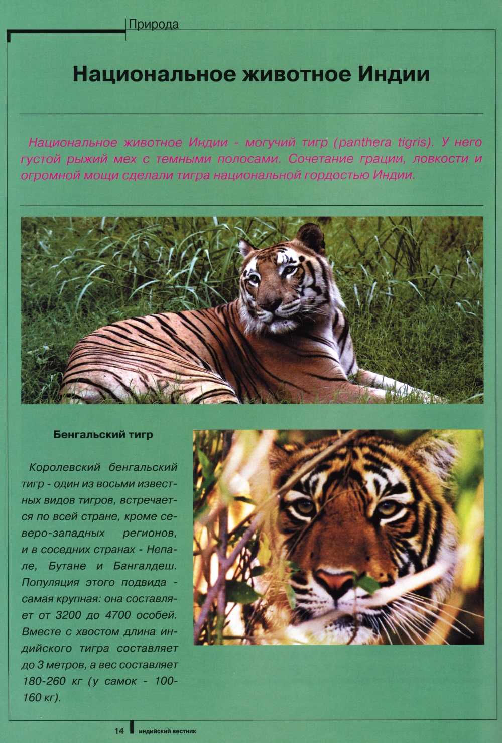 Но вернемся к национальному животному Индии — тигру. Упоминавшееся выше официальное индийское издание «Индийский вестник» ((№ 4-5, 2009 г. рус. яз.) приводит следующие подробности о национальном животном страны: