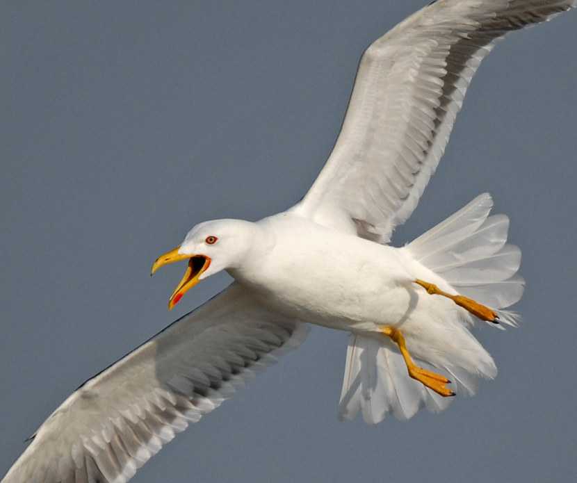 Классический пример хохотуньи с четко различимыми признаками — темный край крыла, белые полосы вдоль крыла. Если присмотреться (фотограф я еще не очень, но честно стараюсь — а с борта движущегося судна фотографировать летящую птицу на б/у телевик то еще развлечение), то на клюве видно оранжевое (иногда красное) пятно — это самый главный отличительный признак. Вторым таким признаком является цвет лап, но сфотографировать такое в полете — нереально