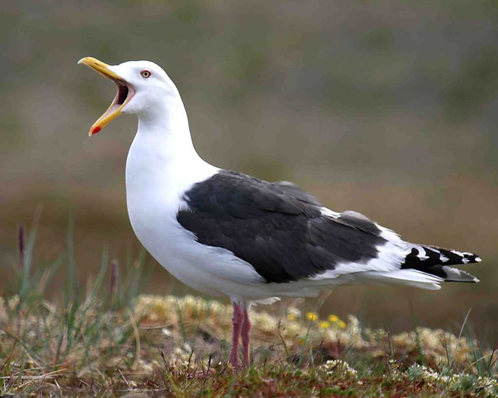 Самая крупная чайка отличается серым оперением всей спины. Только кончики крыльев белые. Эти чайки прекрасные пловцы. Они также могут спать на воде.