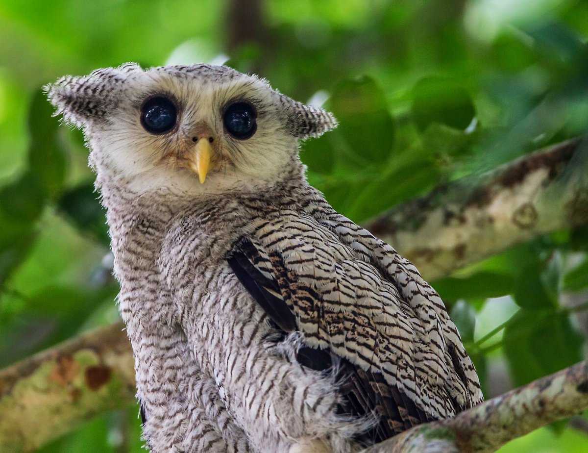 Полосатый филин Вес: 1,2 килограмма. Размер: 53 – 65 сантиметров. Размах крыла: 150 сантиметров. Окрас: темно-коричневый, белый, серый. Где обитает: Западная и Центральная Африка, в Гвинея, Либерия, Гана, Камерун и Габон.