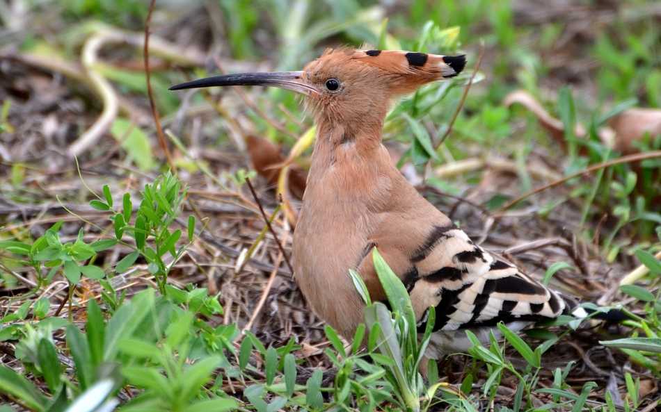 - Природа подарила удоду яркую окраску: у птицы красноватая спинка, черные крылья и хвост украшены белыми полосками. Но главным украшением птицы является хохолок.