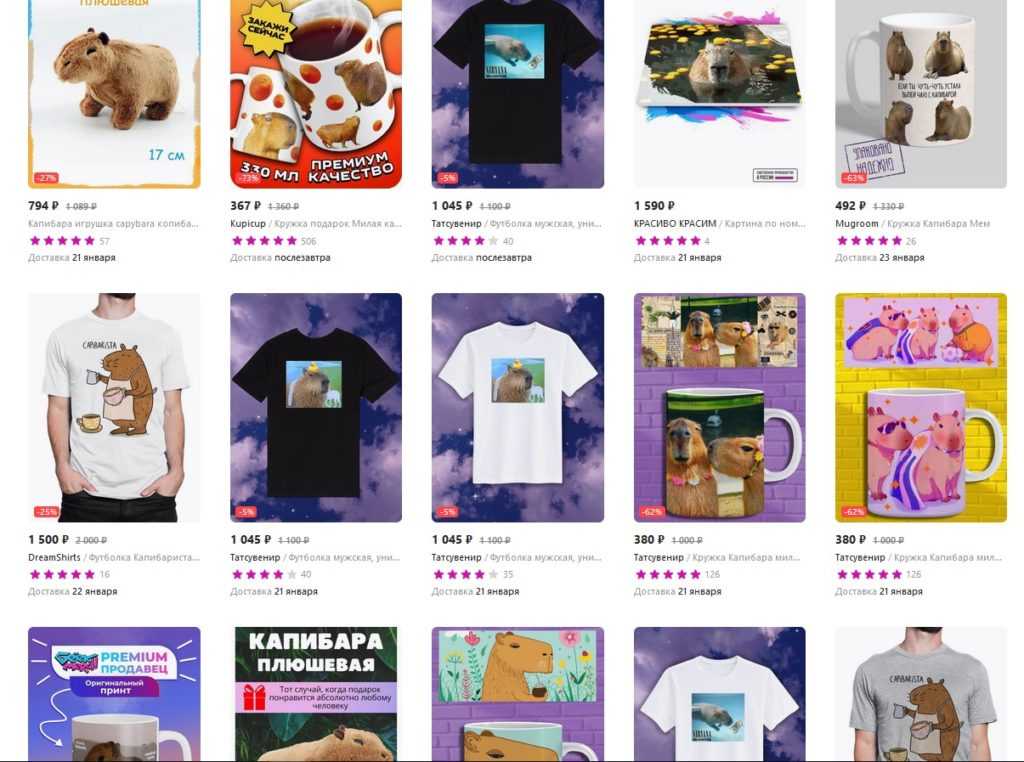 На популярных маркетплейсах можно найти различный мерч с мемными капибарами: футболки, кружки, игрушки.