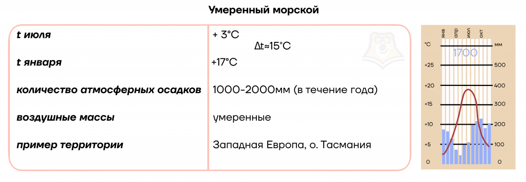 - Морской климат. Характерен для прибрежных зон и океанам. Зима мягкая, лето не знойное, осадков выпадает много, влажность повышенная.