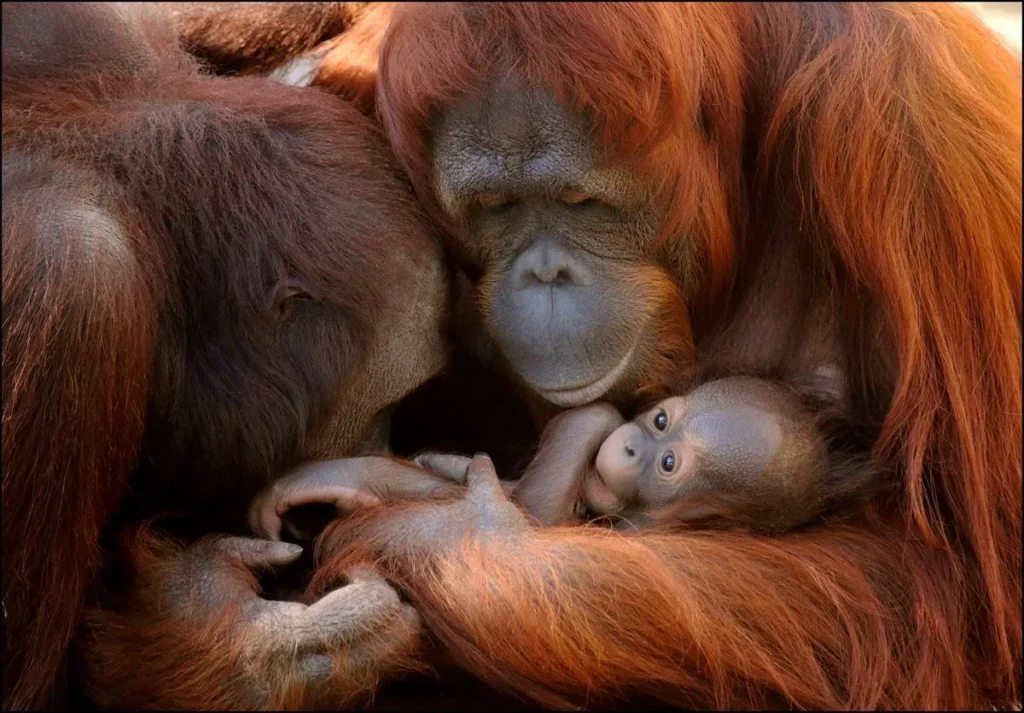 Вообще, между матерью и маленьким орангутаном всегда существует очень тесная связь. Мать заботится о чистоте своего ребенка, часто облизывая его. Отец в процессе появления наследника на свет и его дальнейшего воспитания вообще не принимает участия. Все то, что происходит во время появления малыша пугает главу семейства.