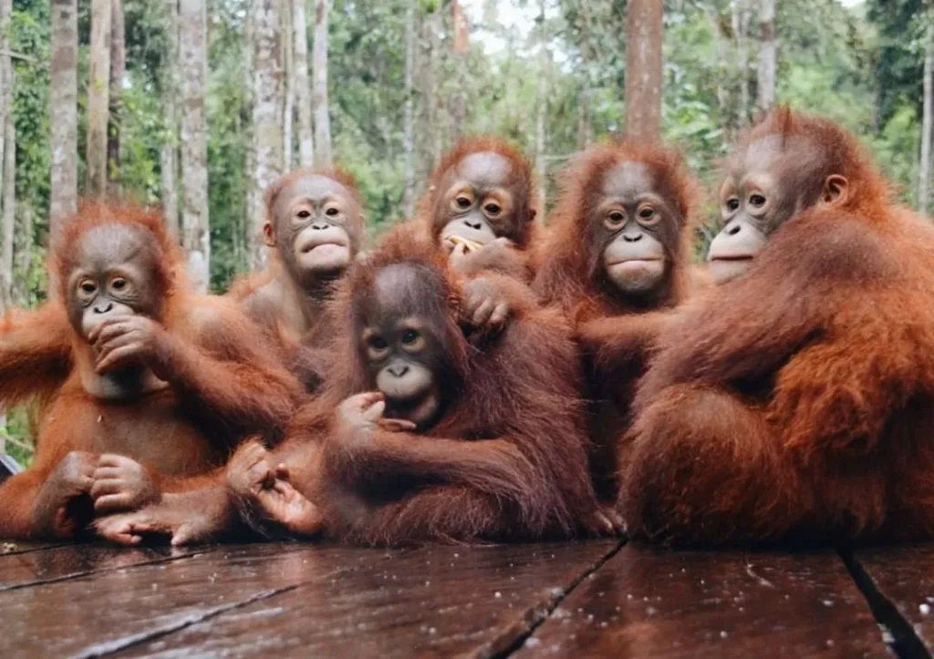 - Образ жизни: Орангутаны из Борнео в основном одиночно обитают и ведут кочевой образ жизни, перемещаясь по всему острову в поисках пищи.