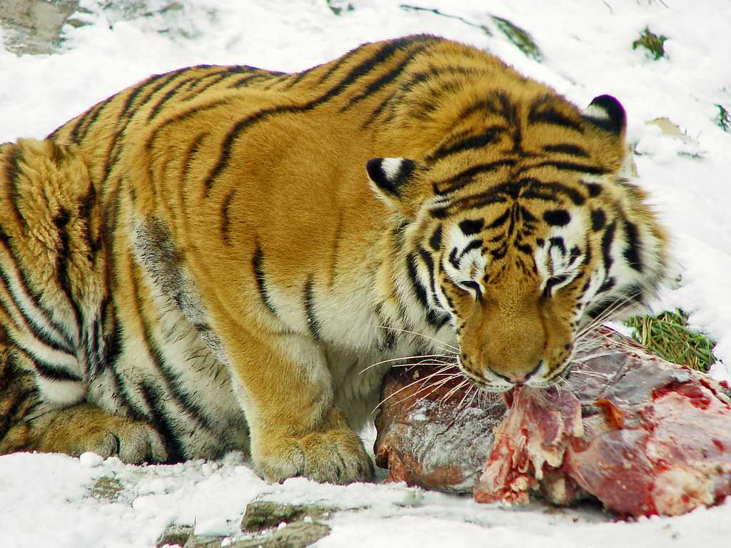 Тигры могут голодать в течение недели, зато за один раз они способны съесть 30-50 кг мяса. А вообще, взрослому хищнику требуется в день от 7 до 9 кг мяса, и за год они съедают около 2-3 тонн пищи, вдвое больше, чем львы.