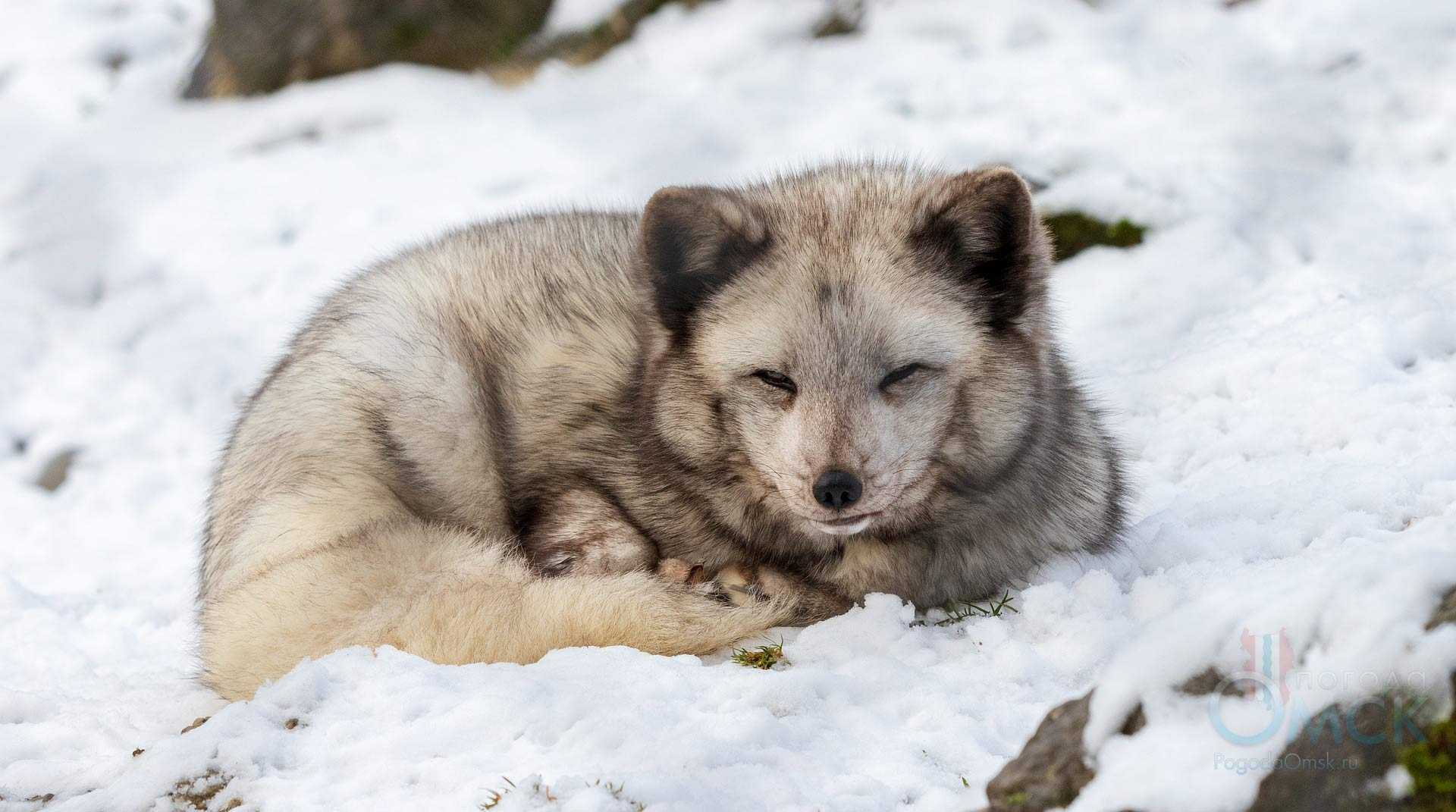 Отдыхает песец свернувшись и прикрыв нос хвостом.