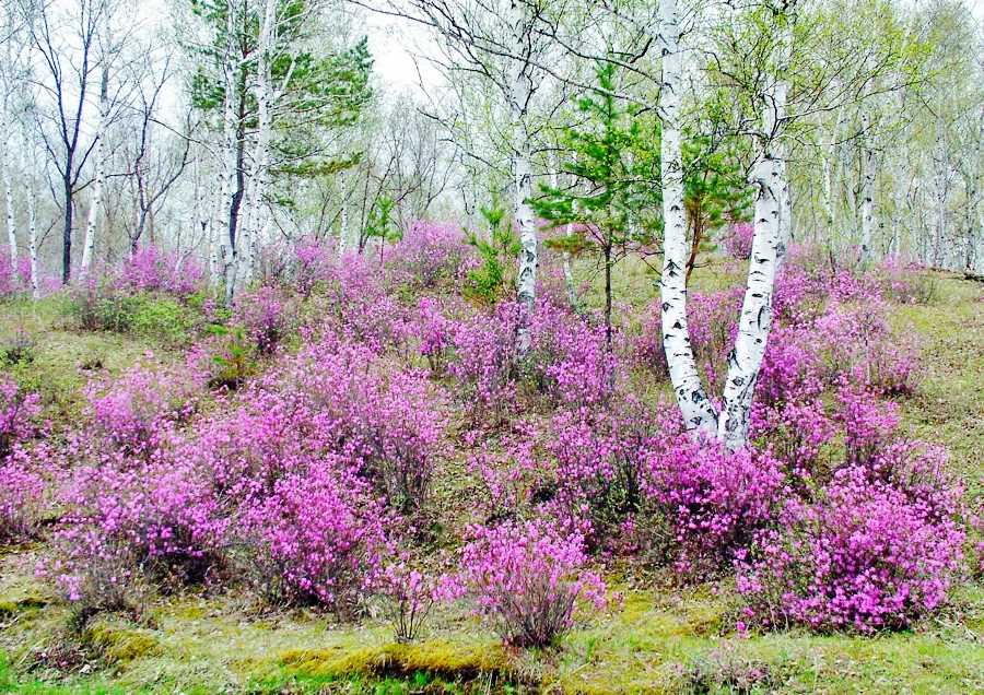 Багульник, даурский рододендрон — предвестник байкальской весны. Он зацветает, когда еще не появилась зелень, окрашивая берега озера Байкал в розовый цвет. Рододендрон растет зарослями, цветет с мая по июнь.