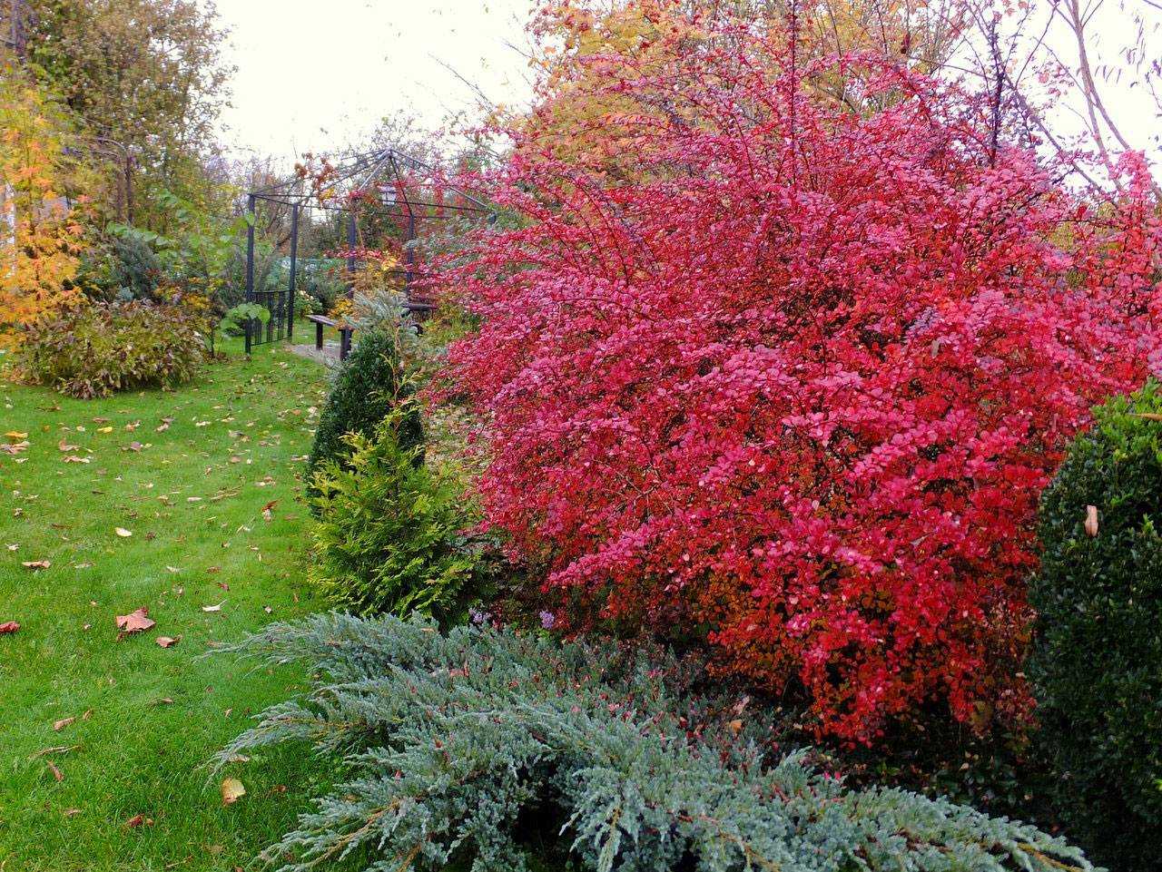 Встречаются растения с алыми, бордовыми, изумрудными и с ярко желтыми листьями. На замену ароматным цветочкам приходят некрупные несъедобные ягоды.