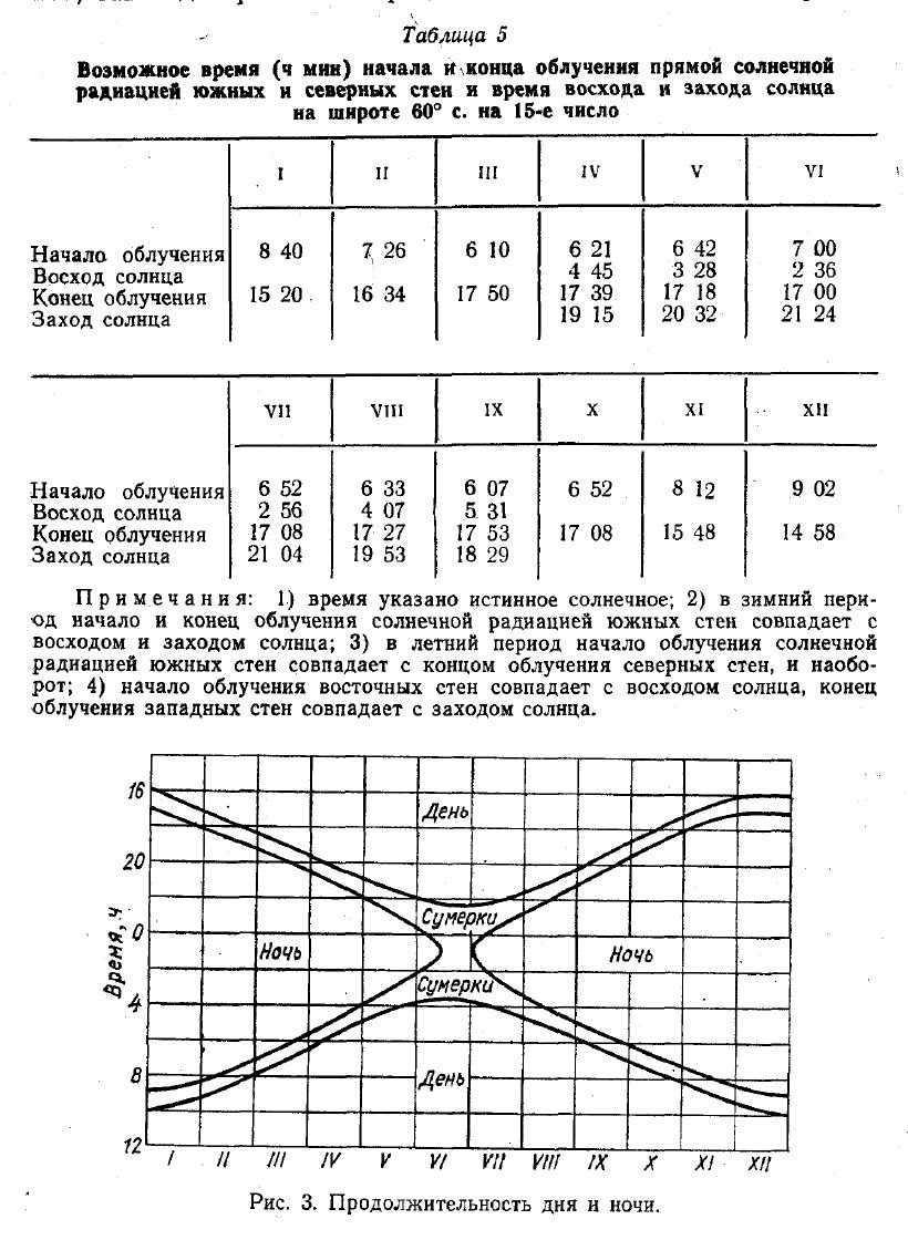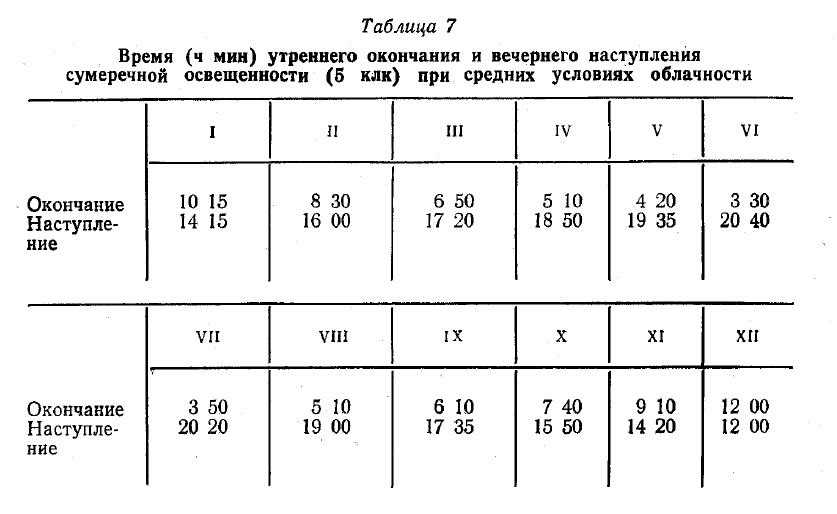 За нижний предел естественной освещенности для бытовых и технических целей принимают освещенность 4—5 клк, называемую сумеречной освещенностью. В табл. 7 содержатся сведения о времени наступления и окончания освещенности величиной 5 клк на широте 60°. Освещенность 5 клк наблюдается при высоте солнца не менее 2°. Гражданские сумерки наступают при переходе солнца через линию горизонта. Освещенность в этот период понижается от 600—650 до 10 лк и считается достаточной для выполнения работ на открытом воздухе без искусственного освещения. В Магадане, так же как и в Ленинграде, в период «белых ночей» уличное освещение не зажигается.