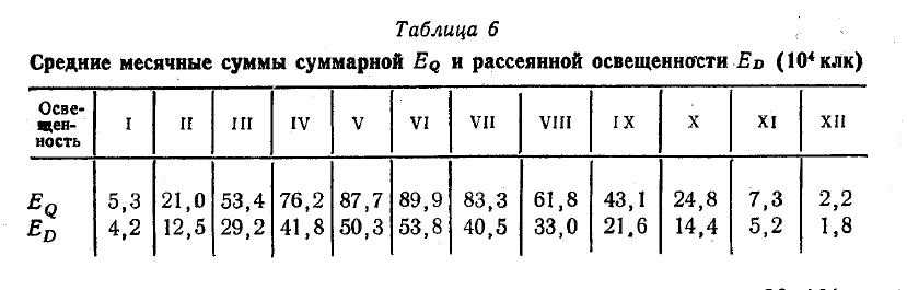 Результаты расчетов суммарной и рассеянной освещенности приведены в табл. 6. Максимальная суммарная и рассеянная освещенность отмечается в июне и составляет соответственно 90-104 и 54-104 клк; минимальная суммарная и рассеянная — в декабре и составляет соответственно 2,2-104 и 1,8-104 клк. В Ленинграде с сентября по май суммарная освещенность ниже, а в летний период выше, чем в Магадане. Рассеянная освещенность в течение года, за исключением , июля и августа, в Магадане выше, чем в Ленинграде.