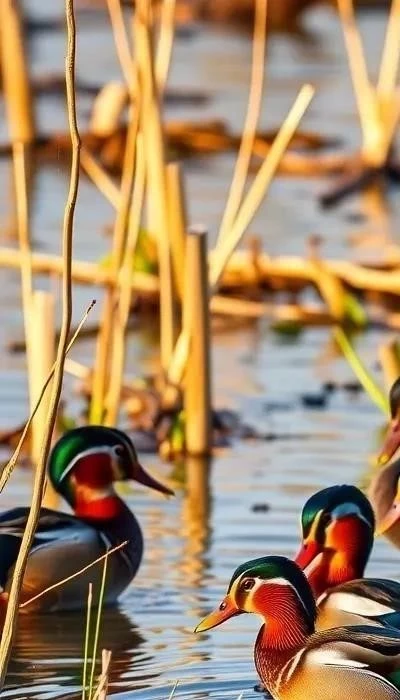 Оперение утки-мандаринки – ее главная гордость. Селезни (самцы) отличаются невероятно яркой и разнообразной окраской. У них рыже-бурая голова с зелеными полосами, белые «брови», каштановая грудь с вертикальными белыми полосами, оранжевые «паруса» на крыльях и серая спина. Брюшко у селезня белое с черными пятнами. Самки мандаринки окрашены более скромно – в серо-коричневые тона, что позволяет им маскироваться во время гнездования. В брачный период самки приобретают более яркую окраску, но все равно уступают селезням в красоте. Оперение мандаринки меняется в зависимости от сезона. После гнездования селезни линяют и приобретают более тусклую окраску, сливаясь с окружающей средой.